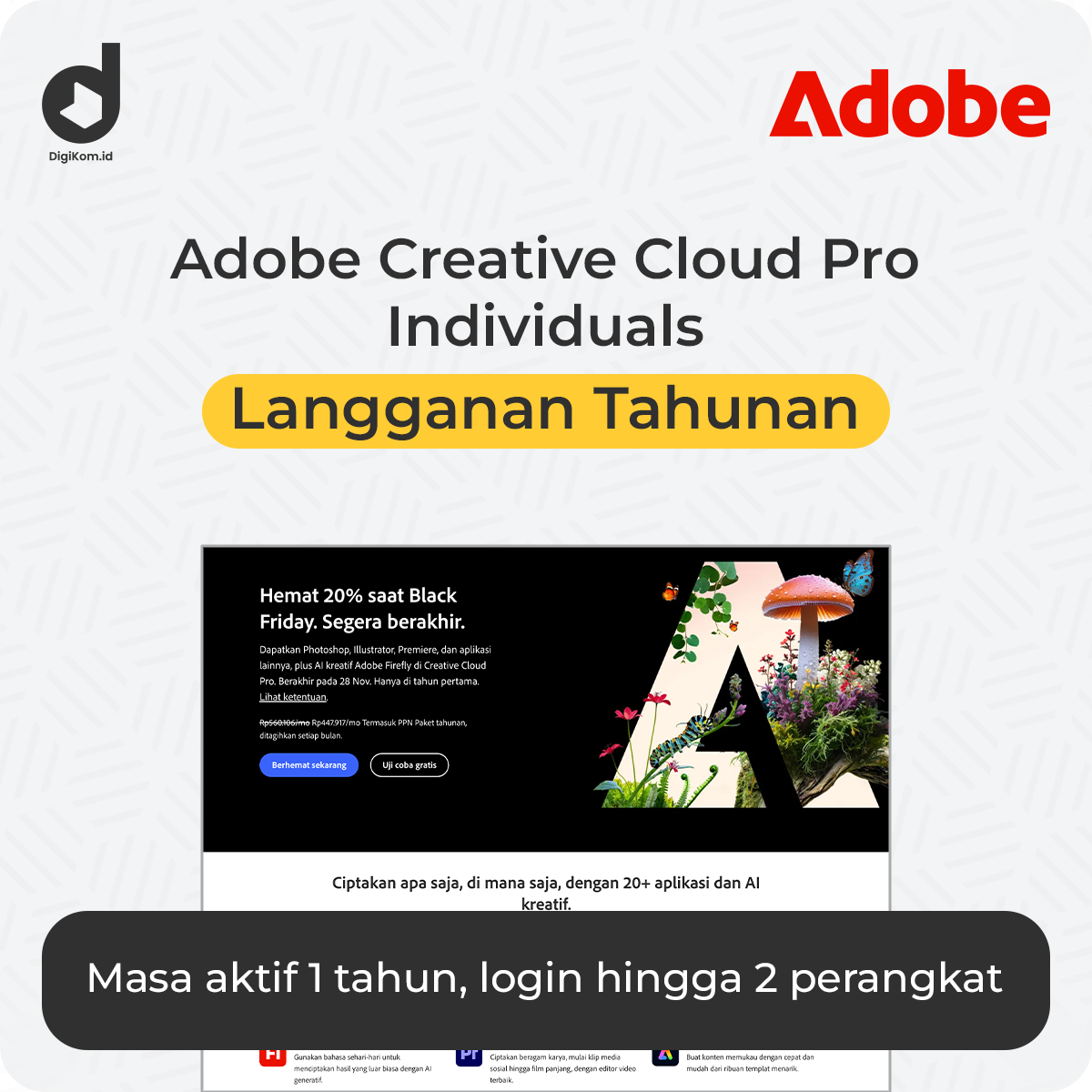 - 🎨 Akses Lengkap +20 aplikasi kreatif Adobe (Photoshop, Illustrator, dll.).